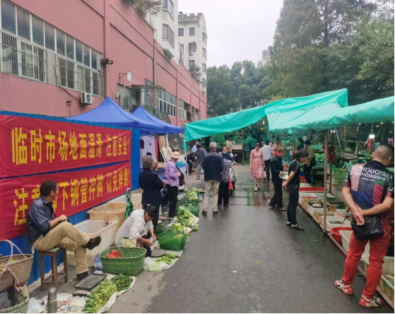 開業(yè)當(dāng)天,過渡市場(chǎng)整體環(huán)境整潔有序,標(biāo)識(shí)規(guī)范統(tǒng)一,市場(chǎng)管理、商戶經(jīng)營都井井有條,前來買菜購物的市民絡(luò)繹不絕。