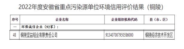 “環(huán)保誠信企業(yè)”稱號是對企業(yè)環(huán)境管理工作給予的充分肯定,同時也為企業(yè)在銀行貸款與環(huán)保評先創(chuàng)優(yōu)等方面提供了優(yōu)勢與機(jī)會。2022年度是堅(jiān)益鋁業(yè)公司首次參加省級環(huán)境信用等級評價,下一步,堅(jiān)益鋁業(yè)公司將以此為契機(jī),以“硬化”內(nèi)部管理為要,更好地履行生態(tài)環(huán)境保護(hù)法定義務(wù)和社會責(zé)任。
