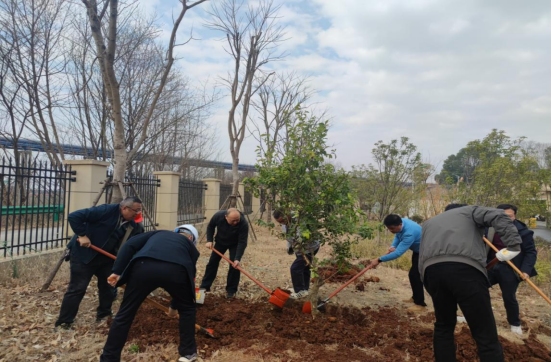 活動現(xiàn)場,處處洋溢著熱火朝天的勞動景象,黨員干部帶頭揮鍬鏟土,大家分組協(xié)作,挖坑、施肥、栽苗、培土、踩實、澆水井然有序,分別種植了桂花樹、柿子樹、橘子樹、桃樹、月季、映山紅等花卉樹木140余株,大力營造“三季有花、四季常綠”的生態(tài)景觀。
