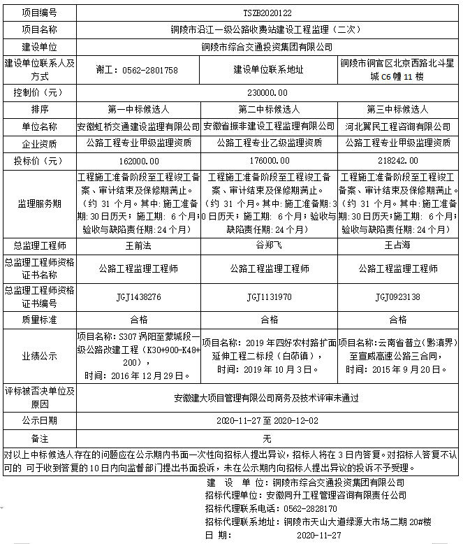 附件:銅陵市沿江一級(jí)公路收費(fèi)站建設(shè)工程監(jiān)理二次中標(biāo)候選人公示.doc:下載