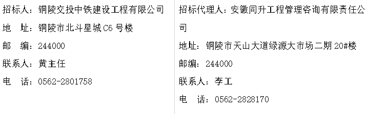 本招標公告同時在銅陵市綜合交通投資集團有限公司網(wǎng)、安徽同升工程管理咨詢有限責任公司網(wǎng)發(fā)布。