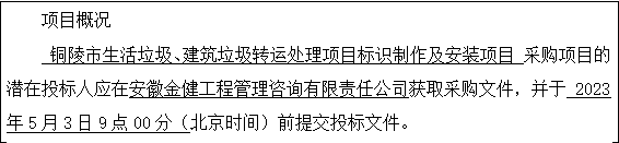 采購需求:銅陵市生活垃圾、建筑垃圾轉(zhuǎn)運(yùn)處理項(xiàng)目標(biāo)識(shí)制作及安裝項(xiàng)目,詳見招標(biāo)文件項(xiàng)目需求內(nèi)容。