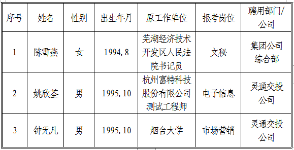 根據(jù)《銅陵市交通投資有限責(zé)任公司招聘人員公告》,現(xiàn)將文秘、電子信息、市場(chǎng)營(yíng)銷擬聘用人員名單公示如下: