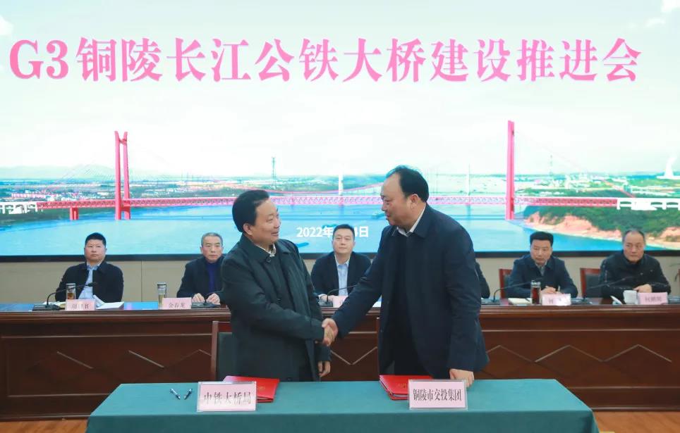 會上,中鐵大橋局與銅陵市交投集團(tuán)舉行了G3銅陵長江公鐵大橋施工合同簽約儀式。