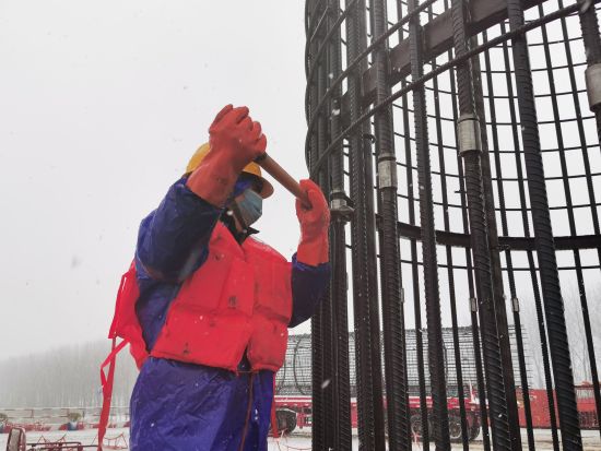 中新網(wǎng)安徽新聞2月7日電 (通訊員趙懿 完顏亮) 2月7日上午,連續(xù)十幾個(gè)小時(shí)大雪后,地上積雪已達(dá)到七八厘米厚,中鐵大橋局G3銅陵公鐵長(zhǎng)江大橋現(xiàn)場(chǎng)在大雪中大干。3#主墩,5臺(tái)旋挖鉆在同時(shí)施工,工人們冒著寒冷和大雪在安裝鉆孔樁的鋼筋籠。項(xiàng)目部為工人配發(fā)了雨衣、保溫棉服等御寒安全用品,保障安全作業(yè)。