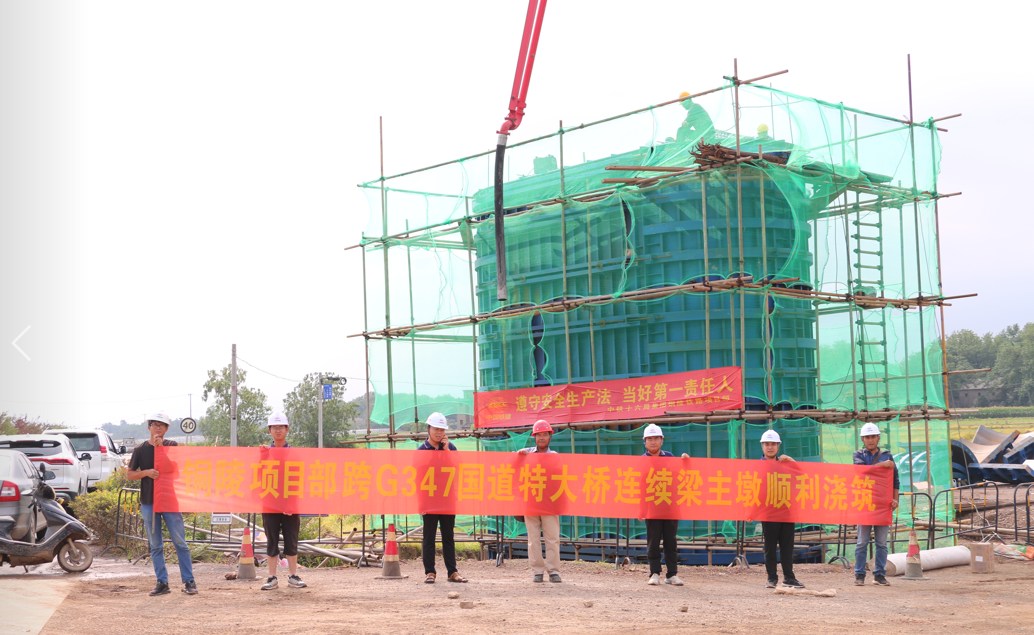 日前,歷經(jīng)6小時連續(xù)施工,銅陵港江北港區(qū)鐵路專用線跨國道G347特大橋連續(xù)梁首個主墩順利澆筑完成。