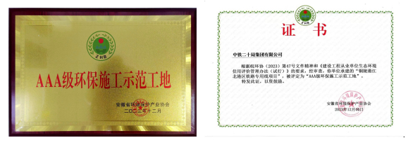 日前,從安徽省環(huán)境保護產業(yè)協(xié)會傳來佳訊,銅陵港江北港區(qū)鐵路專用線項目中鐵二十局施工管段喜獲安徽省2023年度“AAA級環(huán)保施工示范工地”榮譽稱號。